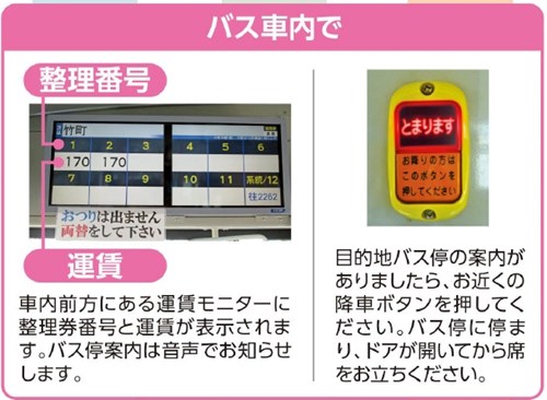 | 運賃表示 | 車内前方の運賃モニターで、整理券番号と運賃をご確認ください。 | |