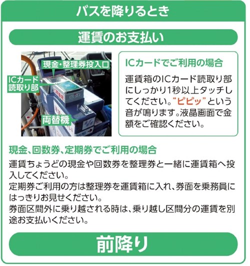| 支払い | 運賃は後払い(200円)。 現金またはSuicaなどの交通系ICカードが利用OK。 |