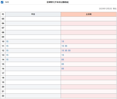 | 東海バス | 平日:10時台〜14時台 休日:10時台〜16時台 |